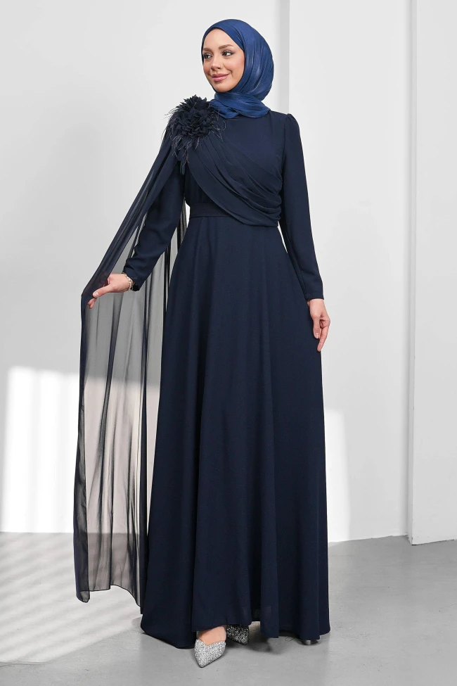 * Ürün Detay : “Gecenin en asil silüeti siz olun!” Derin renk tonu ve omuzdan dökülen zarif şifon peleriniyle, modest stilin en seçkin örneği şimdi stoklarda. Hem kuğu gibi hafif hem de bir kraliçe kadar iddialı hissetmek isteyenler için tasarlandı.Elbisenin en dikkat çekici kısmı sağ omuzdan başlayan şifon pelerin ve üzerindeki çiçek/tüy kombinasyonu. Bu asimetrik dokunuş, elbiseye hareket katarken sıradan bir uzun elbise olmaktan çıkarıp şık bir hava vermiş.Göğüs kısmındaki çapraz gelen drapeler, vücut hatlarını yumuşatırken aynı zamanda üst bedene derinlik kazandırıyor.Etek kesimi "A-line" dediğimiz, belden aşağıya doğru hafifçe genişleyen bir yapıda. Bu kesim hem boyu uzun gösterir hem de konforlu bir kullanım sağlar.