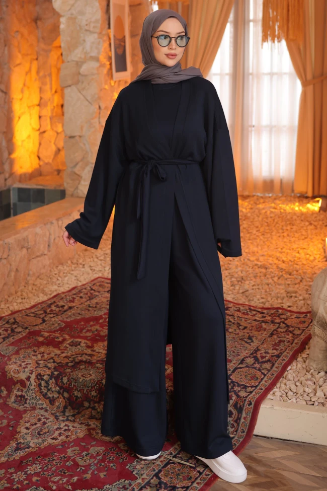 * Ürün Detay :Takımımız modern tesettür giyiminde hem konforu hem de şıklığı bir araya getiren oldukça başarılı bir parça.Silüeti uzun ve ince gösteren dikey bir hat oluşturmuş. Pantolonun bol kesimi hem rahatlık sağlıyor hem de modern "oversize" trendine uyuyor.Hırkanın belden bağlanması, takımın salaşlığını kontrol altına alarak bele vurgu yapmış ve kıyafete daha formlu, kadınsı bir hava katmış.Bu takım tam bir "eforsuz şıklık" örneği.Kumaşın dökümü kaliteli bir duruş sergiliyor.Pantolon yüksek bel ve bel lastiklidir.