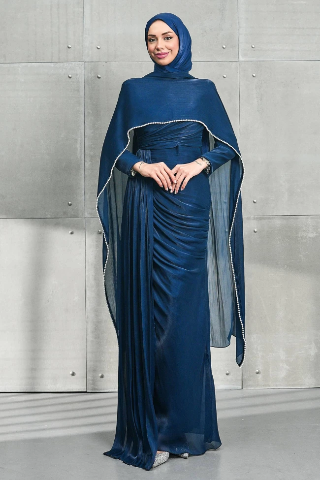 * Ürün Detay : Özel günleriniz için kurtarıcı parça! Kendinden pelerinli tasarımı sayesinde aksesuar zahmetine girmeden tam bir şıklık sunan abiyemiz, dikey pileli etek yapısıyla daha uzun ve ince bir görünüm vadediyor.Modern tesettür şıklığını inci zarafetiyle birleştirin.Bel bölgesindeki çapraz drape detayları, karın bölgesini kusursuz bir şekilde kamufle ederken, eteğin dikey pilleleri boyu olduğundan daha uzun gösteriyor.Omuzlardan dökülen tül pelerin, tasarıma dramatik bir hava katarken, kenarlarındaki inci işlemeler yüz hattını aydınlatan zarif bir çerçeve oluşturuyor.