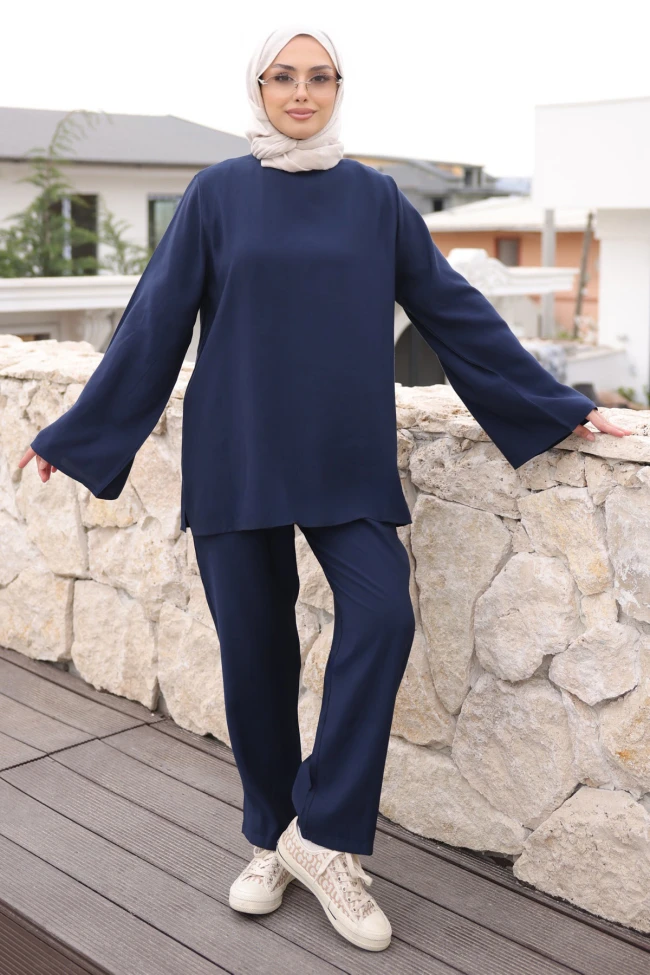 * Ürün Detay : Takım, minimalist tasarımı ve konforu ön plana çıkaran dökümlü yapısıyla tam bir "çabasız şıklık" örneği.Takımın en karakteristik özelliği olan İspanyol kol detayı, minimalist tasarıma zarif bir hareketlilik katmış.Tunik ile mükemmel uyum sağlayan, ne çok dar ne çok geniş olan boru paça kesim. Bu kesim, hem sneakerlarla sportif hem de topuklularla şık bir görünüm elde etmeyi sağlar.Pantolon bel lastiklidir.Yüksek beldir.Ceplidir.