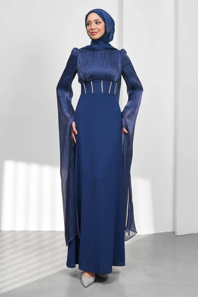* Ürün Detay : Abiye, hem asil hem de dramatik detaylarıyla tam bir "özel gün" tasarımı.Elbisenin en çarpıcı yeri kesinlikle pelerin etkili uzun kolları. Omuzdan yere kadar uzanan piliseli janjan kumaş, yürürken veya hareket ederken elbiseye muazzam bir akışkanlık kazandıracaktır. Bu tarz kollar, kişiye olduğundan daha uzun ve görkemli bir hava katar.Bel kısmındaki geniş kemer , arkadaki bağcık detayıyla birleşince bel hattını çok güzel vurguluyor. Arkadan bakıldığında korsaj havası vererek beli daha ince gösteriyor.Göğüs kısmındaki büzgüler elbiseye hacim katarken, eteğin düz inişi bu hacmi dengeliyor ve karmaşayı önlüyor.