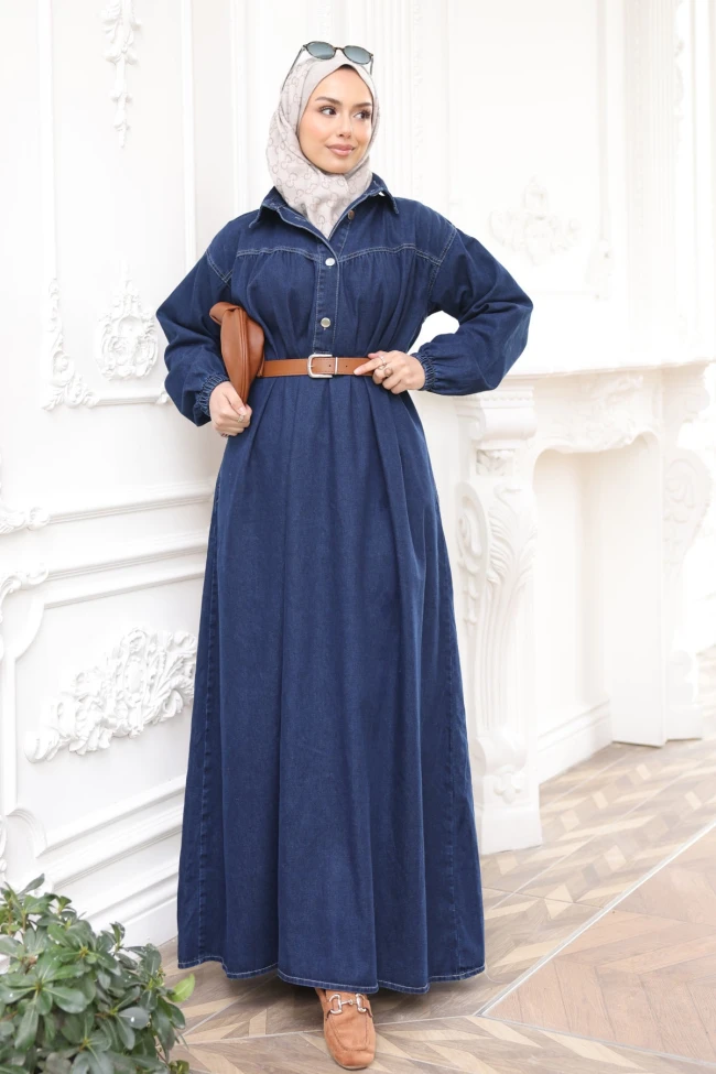 * Ürün Detay : Elbisemiz, denim şıklığını tesettür modasına çok zarif bir şekilde uyarlamış.Üst kısımdaki gömlek yaka tasarımı elbiseye ciddiyet katarken, göğüs hizasındaki hafif büzgülü roba detayı kesimi hareketlendirmiş.Belden aşağıya doğru genişleyen kesim, hem konforlu bir kullanım sunuyor hem de oldukça zarif bir silüet oluşturuyor.Ürünümüz kemerlidir.Satışa kemer dahildir.