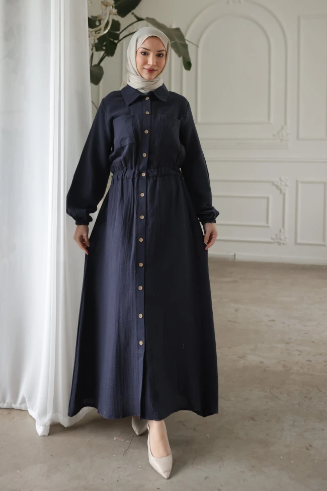 * Ürün Detay : Günün her anında hem çabasız bir şıklık hem de sınırsız konfor arayan kadınlar için tasarlanan bu özel parça, gardırobunuzun yeni favorisi olmaya aday. Modern kesimiyle geleneksel çizgileri harmanlayan bu elbise, stil sahibi bir duruş sergilemenizi sağlıyor.Bel hattında yer alan elastik büzgü detayı, vücut hatlarınızı zarifçe vurgularken konforunuzdan ödün vermez. Her vücut tipine mükemmel uyum sağlar.Göğüs kısmındaki çift cep detayı ve boydan boya uzanan düğme tasarımıyla hem spor hem de klasik bir hava sunar.