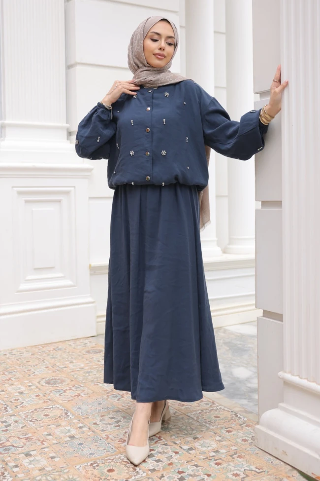 * Ürün Detay : Şık tasarımı ve taş detaylarıyla yeni sezon takım modelimiz sizlerle.Etek ve üst parçanın rahat kesimi, şıklığı konforla birleştirmiş.Üst parçadaki taş işlemeler, düz bir takımı anında "özel gün" veya "şık davet" kategorisine taşımış. İşlemelerin çiçek formunda ve simetrik dağıtılması, tasarıma hareket katarken zarafeti korumuş.Kollardaki büzgülü manşet detayları modern bir dokunuş sağlarken, beldeki lastik kısmı takımın formunu koruyarak daha derli toplu durmasını sağlamış.