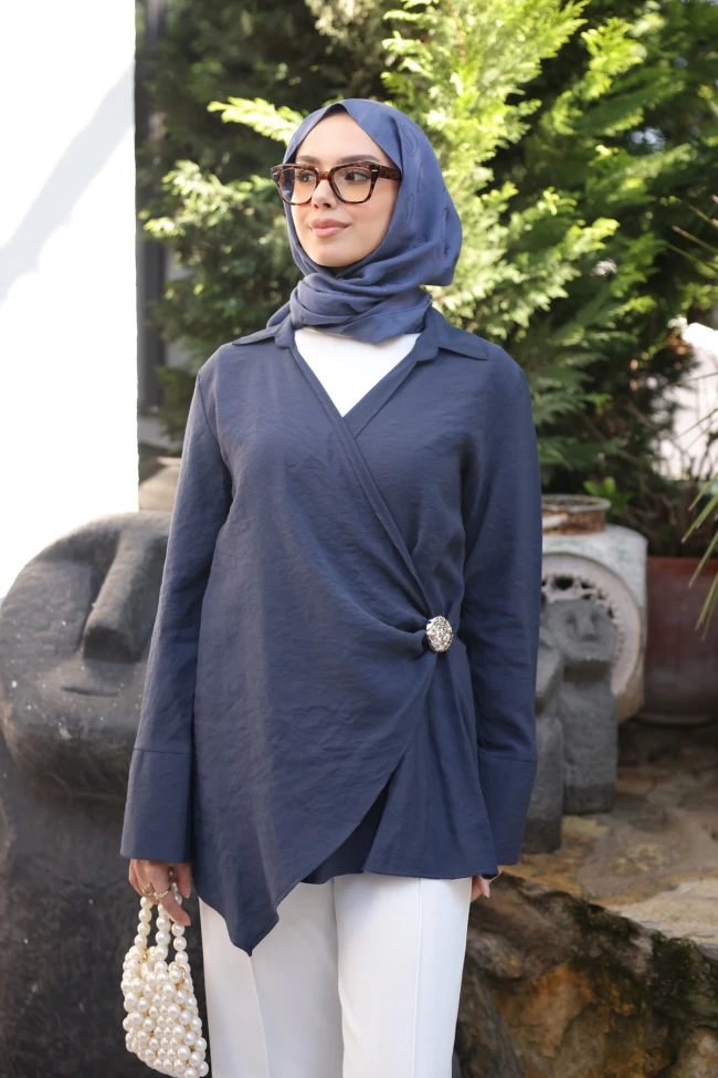 * Ürün Detay : Gömlek, "sessiz lüks" akımına göz kırpan, zamansız bir yatırım parçası gibi duruyor.Gömlek, klasik tunik anlayışını modern ve sofistike bir dokunuşla yeniden yorumlayan, oldukça asil bir parça.Gömleğin en belirgin özelliği, öndeki kruvaze geçiş ve bu geçişin oluşturduğu doğal drapeler. Bu asimetrik duruş, vücut hatlarını yumuşatarak oldukça zarif bir silüet çiziyor.Bel kısmındaki ışıltılı büyük broş, tasarıma lüks bir hava katmış. Bu detay, gömleği sadece günlük bir parça olmaktan çıkarıp akşam yemekleri veya özel davetler için de uygun hale getiriyor.Geniş ve belirgin manşetler, gömleğin maskülen gömlek yapısını korurken, derin V yaka kesimi modern bir tesettür stiline uyarlanmış.Bel düğmelidir.
