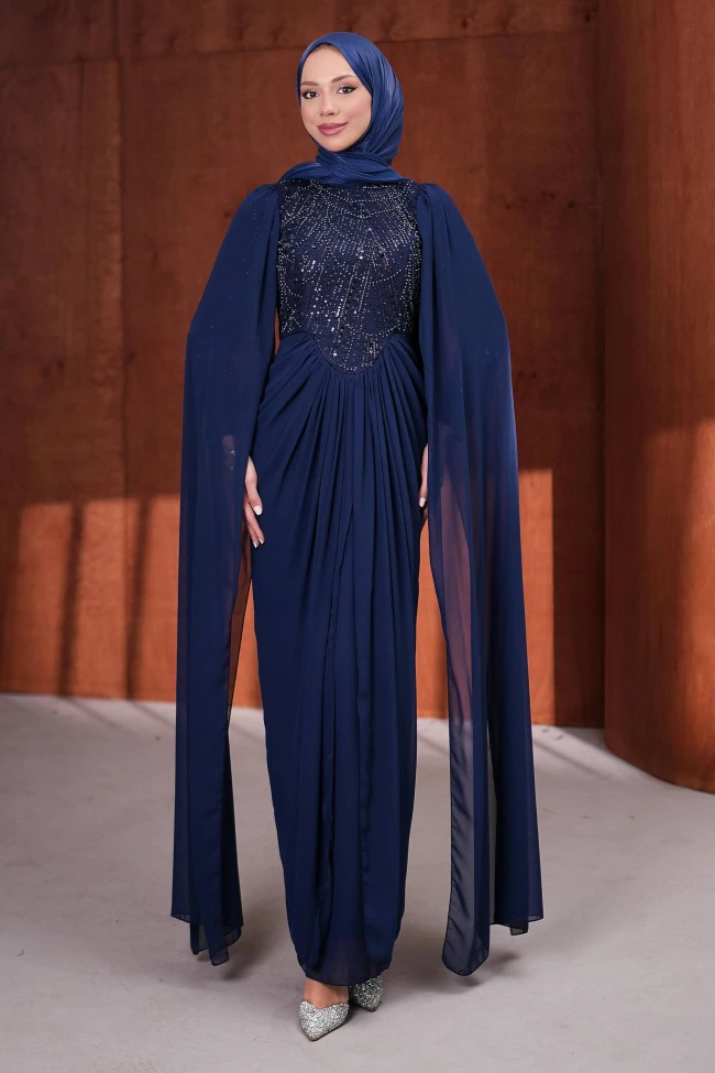 * Ürün Detay : Özel günlerin en şık ismi olurken, drape kesimin sağladığı hareket özgürlüğüyle gecenin tadını doyasıya çıkarın.Göğüs kısmındaki işlemeleri, kıyafete lüks bir hava katarken tüm dikkati yüze ve üst bedene çekiyor. İşlemelerin V formunda aşağı doğru inmesi, beli olduğundan daha ince gösteren illüzyonist bir dokunuş.Omuzlardan aşağı süzülen şifon pelerin detayları, hareket ettikçe büyüleyici bir akışkanlık sağlıyor. Bu detay hem kollarını kapatmak isteyenler için şık bir çözüm sunuyor.Karın bölgesinden başlayan dikey pileler ve "drape" kesim, vücut hatlarını yumuşatırken boyu daha uzun gösteriyor.