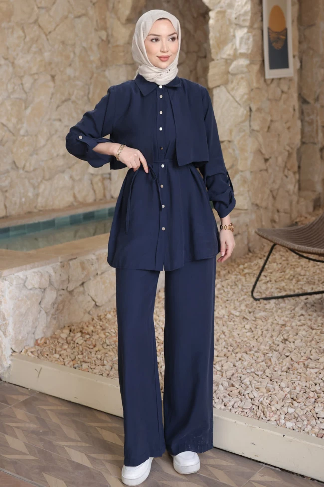 * Ürün Detay : Takım, hem modern hem de oldukça şık bir tasarıma sahip.Beldeki bağlama detayı vücut hatlarını zarifçe belirginleştirirken, göğüs kısmındaki katmanlı (pelerin havası veren) detay tasarıma hareket katmış.Düğmeli olması kullanım kolaylığı sağlıyor.Bol paça kesim, hem gün boyu konfor sunar hem de boyu olduğundan daha uzun gösterir. Kumaşın dökümlü yapısı takımın kalitesini ön plana çıkarıyor.Pantolon bel lastikli ve cepli.