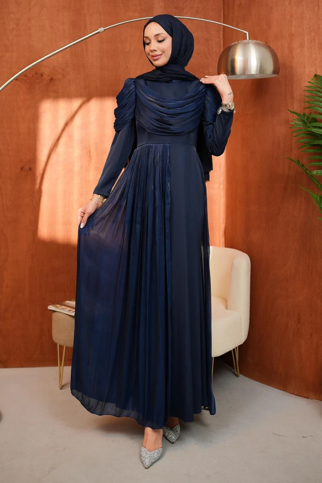 * Ürün Detay : Abiye, tam bir zarafet örneği.Dramatik kollar, kusursuz drapeler...Göğüs kısmındaki çapraz geçişli drapeler ve omuzdan dökülen piliseli detaylar, tasarıma derinlik ve boyut katıyor. Bu detaylar elbiseye hem sofistike bir hava veriyor hem de vücut hatlarını çok zarif bir şekilde dengeliyor.Etekteki pilise detayları ve belden süzülen hafif şifon etkisi, yürürken adeta bir peri masalı silüeti oluşturuyor.Sırt fermuarlıdır.
