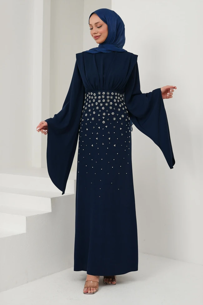 * Ürün Detay :Zarafeti ve modest çizgi çok başarılı bir şekilde harmanlamıştır. Elbisenin en dikkat çekici kısmını oluşturan geniş ve dökümlü kollar, tasarıma hem dramatik bir hava katıyor hem de hareket özgürlüğü sağlıyor. Bu kesim, omuz hattını daha zarif gösterirken elbiseye modern bir silüet kazandırmış.Bel bölgesindeki yoğun taş ve boncuk işlemeleri, dikkati vücudun en ince noktasına çekerek proporsiyonu dengeliyor.