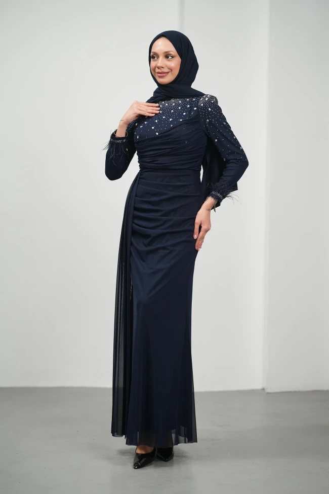 * Ürün Detay : Manşetlerde kullanılan tüy detayları, bu sezonun en popüler trendlerinden biri. Bu detay, elbiseye hareket ve lüks bir dokunuş ekliyor.Abiye modelimiz, klasik zarafeti modern ve iddialı detaylarla harmanlayan, tam bir "gece şıklığı" parçasıdır. Omuz ve göğüs bölgesinde yoğunlaşan gümüş taş işlemeleri, abiyemizin asaletini ön plana çıkarırken yüze aydınlık bir ifade katıyor. Bel bölgesindeki asimetrik drapeler, vücut hatlarını zarifçe şekillendiriyor. Yan taraftan süzülen şifon pelerin detayı, yürüyüş esnasında dramatik ve akışkan bir görüntü oluşturacaktır.