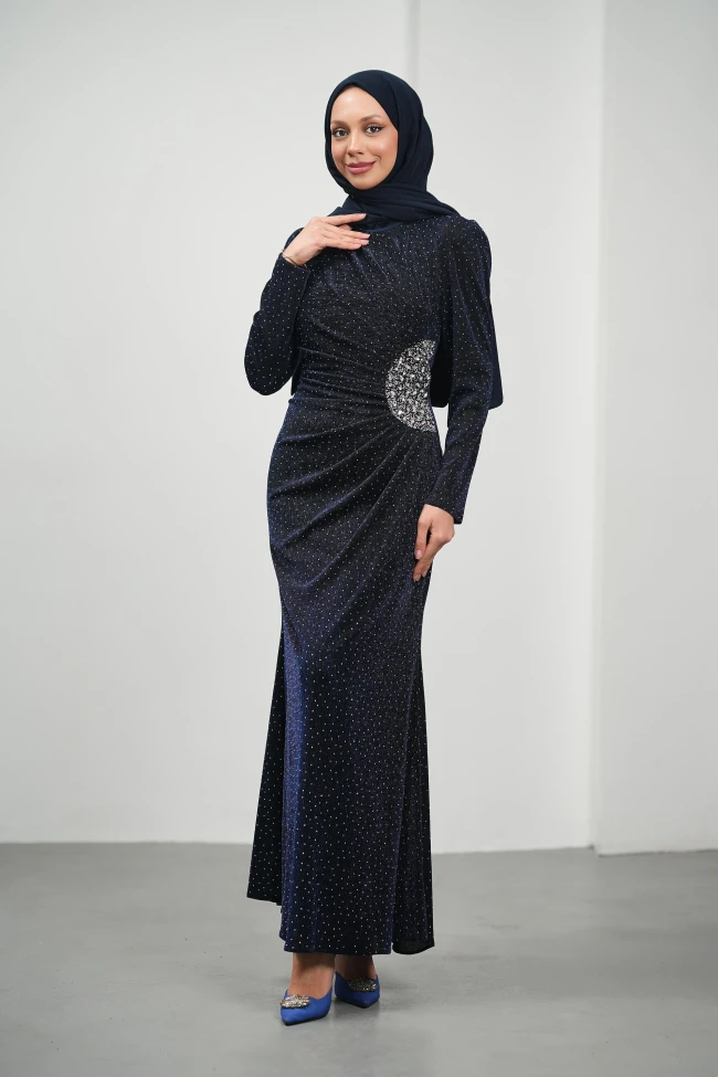 * Ürün Detay : Yeni sezon abiye modelimiz "gece şıklığı" kavramını modern ve ışıltılı detaylarla yeniden yorumlayan oldukça iddialı bir tasarım.Abiyemizin genelinde kullanılan ışıltı baskılı doku, tasarıma göz alıcı bir parlaklık kazandırmış.Bel kısmındaki dökümlü drapeleri toplayan ay formundaki taşlı broş, tasarımın ana odak noktasını oluşturuyor. Bu detay, hem bel hattını zarifçe vurguluyor hem de elbiseye lüks bir hava katıyor.Vücudu naif bir şekilde saran balık kesim formu, boyu daha uzun ve silüeti daha ince gösteren profesyonel bir kalıba sahip.Hafif vatkalı omuz yapısı ve bileğe doğru daralan kol kesimi, tasarıma vakur ve modern bir duruş eklemiş.