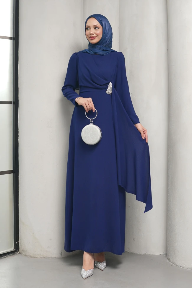 * Ürün Detay : Yeni sezon abiyemiz, "zamansız şıklık" tanımına uyan, son derece zarif ve ağırbaşlı bir tasarıma sahip.Göğüs kısmından bele doğru inen asimetrik drapaj, elbiseye derinlik ve hareket katıyor. Belde toplanan bu katmanlar, silüeti daha ince ve uzun gösteren bir illüzyon yaratıyor.Beldeki broş detayı abiyenin sadeliğini kırarak odak noktası oluşturuyor.