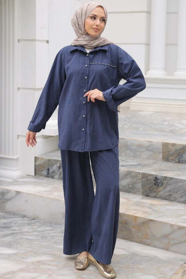 * Ürün Detay : Takım, hem modern hem de klasik çizgileri birleştiren, oldukça zarif bir şıklık sunuyor.Geniş paça pantolon ve dökümlü gömlek ikilisi, güncel "oversize" trendine uygun, konforlu bir silüet çiziyor.Tuniğin cebindeki ince taş işlemesi, düz ve sade tasarımı hareketlendirerek takıma hoş bir hava katmış.Pantolon bel lastikli ve ceplidir.