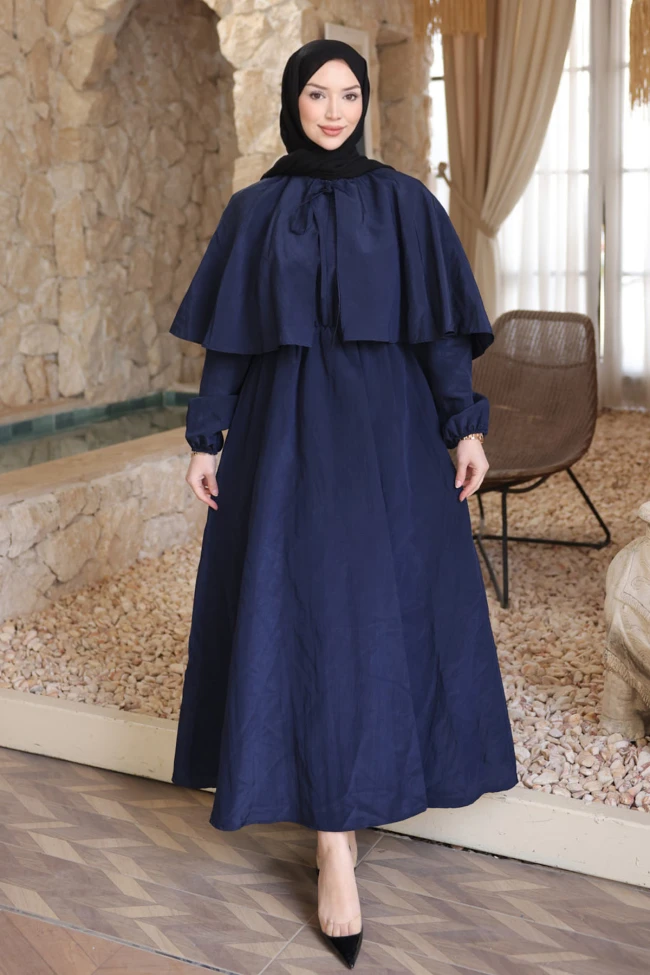 * Ürün Detay : Elbise, hem modern hem de geleneksel çizgileri birleştiren, oldukça karakteristik bir tasarıma sahip.Elbisenin en dikkat çekici özelliği omuzlardan göğüs hizasına kadar inen pelerin parçası. Bu detay, elbiseye hem sofistike bir hava katıyor hem de tesettür giyimde omuz ve göğüs hatlarını çok şık bir şekilde gizliyor.Beldeki hafif büzgü, formun fazla salaş görünmesini engelleyerek zarif bir silüet oluşturmuş. Lastikli kollar ise pelerin detayıyla dengeli bir bütünlük sağlıyor.