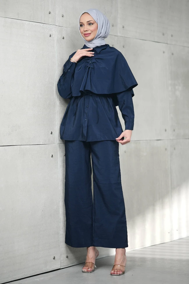 * Ürün Detay : Gardırobunuzun Yeni Yıldızı!Hem özel günlerde hem de günlük şıklıkta fark oluşturmak isteyenler için sizlerle.Takım ile zarafeti üzerinizde taşıyın!Üst kısımdaki pelerin detayı, takıma sofistike ve özgün bir hava katıyor.Ön kısımdaki zarif düğme detayları, şıklığı tamamlayan küçük ama etkili bir dokunuş.Takımın pantolonu, gün boyu hareket özgürlüğü sağlayan rahat bir kalıba sahip.Pantolon bel lastiklidir ve ceplidir.