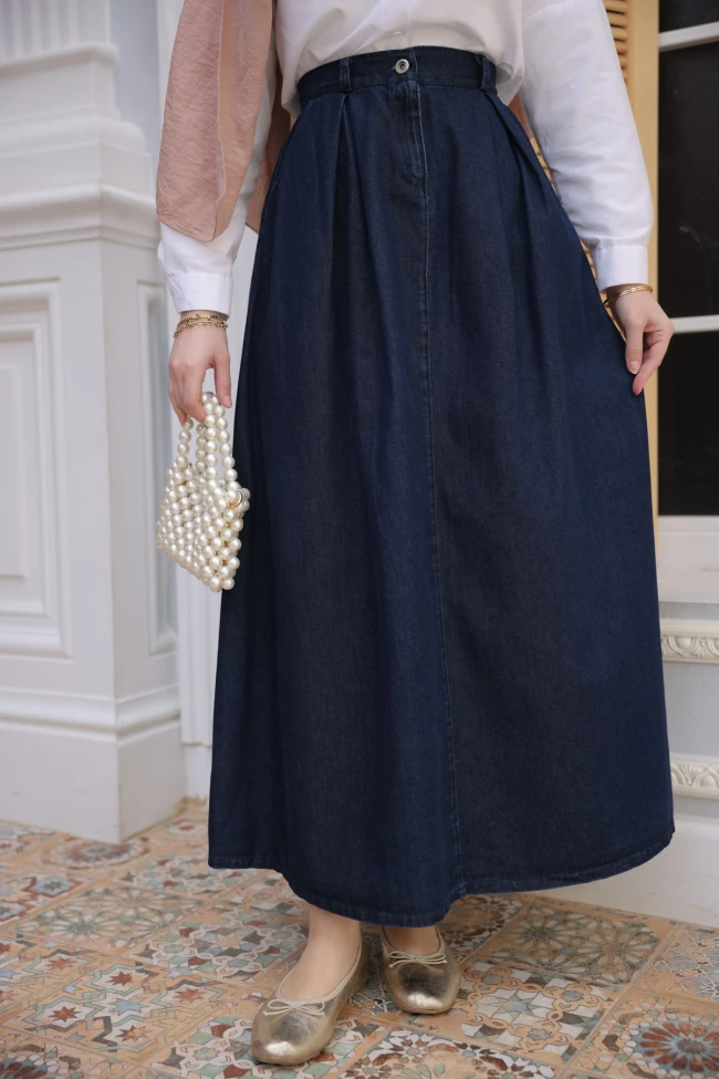 * Ürün Detay : Etek, klasik jean dokusunu feminen bir silüetle birleştiren, özellikle tesettür giyimde "A-kesim" formunun en konforlu örneklerinden biri.Eteğin en güçlü yönü beldeki pile detayları.Etek ucundaki koyu renkli şerit (yıkama izi), tasarıma modern bir dokunuş katmış ve eteğin dökümünü ağırlaştırarak daha kaliteli durmasını sağlamış.