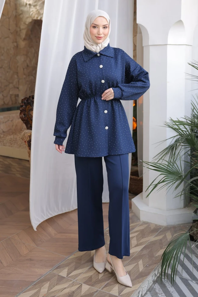 * Ürün Detay : Günün her anında hem konforlu hem de göz alıcı olmak isteyenler için tasarlanan bu ikili takım, rengi ve ince taş detaylarıyla fark oluşturuyor. Ceket formundaki üst parçanın bel kısmındaki büzgü detayı, feminen bir silüet oluştururken; geniş paça pantolonu gün boyu hareket özgürlüğü sunuyor.Pantolon bel lastikli.Tunik düğmeli.