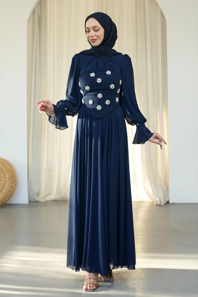 * Ürün Detay :Elbisenin en dikkat çekici kısmı, gövdeyi saran korsaj yapısı. Üzerindeki çiçek formundaki taş işlemeler, abiyenin asaletine ışıltı katarak  "gece kıyafeti" statüsüne taşıyor. Korsajın alt kısmındaki hafif V kesim, beli daha ince ve uzun gösterme etkisine sahip.Şifon kolların bilek kısmındaki volan detayları, tasarıma romantik ve hareketli bir hava katmış. Bu tarz kollar, hareket halindeyken çok zarif bir akışkanlık sağlar.Etek kısmında kullanılan bol dökümlü şifon kumaş, elbiseye hem hafiflik hem de görkemli bir duruş kazandırıyor.