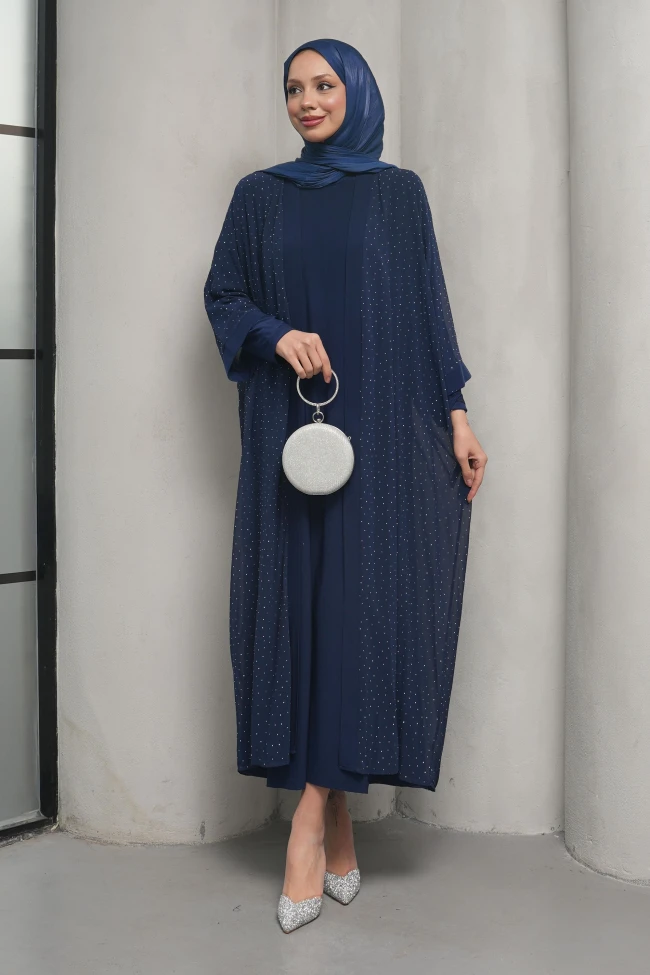 * Ürün Detay :Görseldeki abaya takımı oldukça zarif ve modern bir çizgiye sahip.İnce ve dökümlü şifon kumaş kullanılmış. Bu, abayanın hem hafif hem de hareketli durmasını sağlıyor.Üzerindeki küçük taş işlemeleri, düz rengin ağırlığını kırarak ürüne şık bir gece kıyafeti havası katmış. Taşların sıklığı "yıldızlı gökyüzü" efektini çok iyi veriyor.Kimono kesim kollar ve maksi boy, abayanın geleneksel formunu korurken; iç kısımdaki düz siyah elbise ile kombinlenmesi takımı bütüncül ve kullanışlı hale getirmiş.