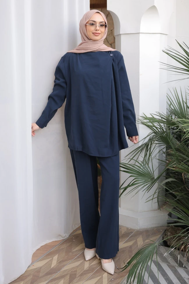 * Ürün Detay : Takım, asimetrik kesimi ve dökümlü yapısıyla modest şıklığın en rafine örneklerinden biri. Sadeliği bir tasarım detayıyla taçlandırarak "çabasız zarafet" kavramını tam anlamıyla karşılıyor.Takımın en belirgin özelliği asimetrik kruvaze kapama detayı. Omuz kısmındaki tek düğme detayıyla birleşen bu asimetrik kesim, takıma modern ve mimari bir form katmış. Yaka kısmının kapalı ve temiz bitişi, ürüne asil bir hava veriyor.Geniş paça pantolon, üst parçanın dökümüyle bütünleşerek boyu daha uzun gösteren akıcı bir silüet oluşturuyor.
