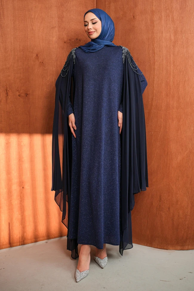 * Ürün Detay : Abiye, zarafeti ve modern detayları bir araya getiren tam bir "gece yıldızı" tasarımı.Omuzlardan aşağı süzülen şifon pelerin detayları, tasarıma dramatik ve asil bir hava katıyor. Bu detay, yürürken hareket özgürlüğü sağlarken aynı zamanda güçlü bir silüet oluşturuyor.