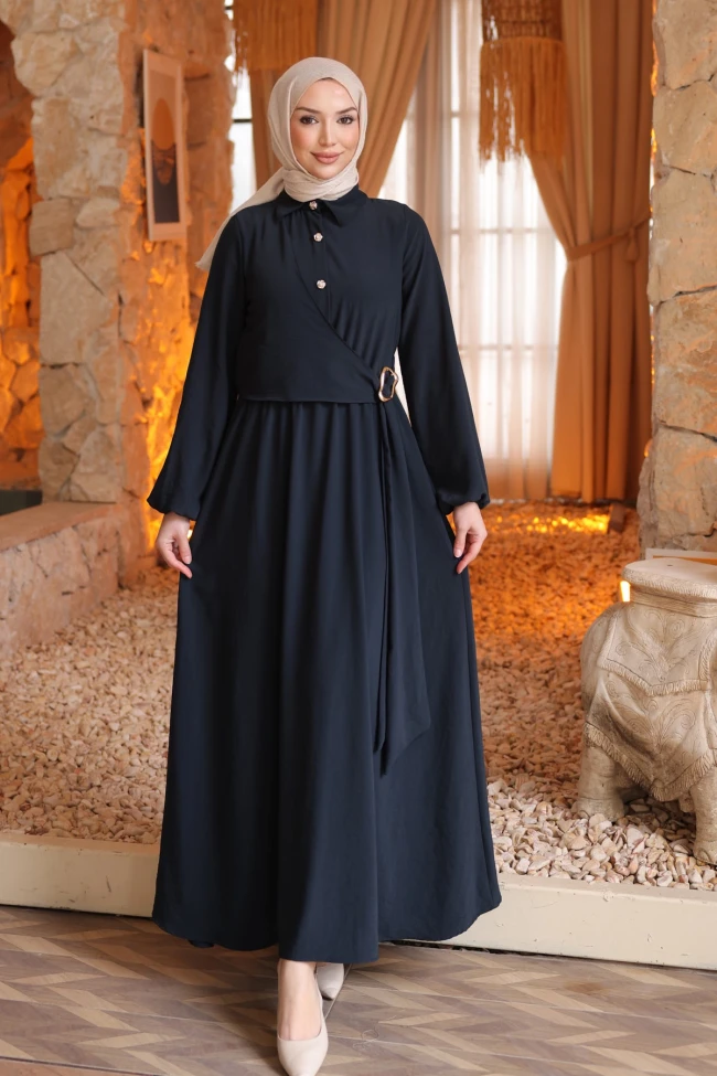 * Ürün Detay : Elbise, hem zarafeti hem de fonksiyonelliği bir araya getiren modest bir stil sunuyor.Üst kısımdaki kruvaze kesim, elbiseye hareket katarken, yandaki metalik toka detayı beli vurgulayarak daha formlu bir görünüm sağlıyor.Bilekten lastikli manşetli "balon kol" tasarımı, hem konfor sunuyor hem de elbiseye vintage bir hava katıyor.Yakadaki küçük metalik düğmeler, düz renk kumaşın sade görünümünü şık birer noktayla bölerek hareketlendirmiş.