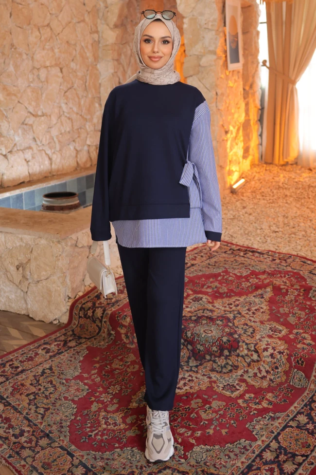* Ürün Detay : Geleneksel tunik rahatlığını gömlek detaylarının şıklığıyla birleştiren, modern ve özgün bir "iki parçalı set" olarak öne çıkıyor. Tuniğin altından ve kollarından çıkan mavi-beyaz çizgili gömlek parçaları, takıma hareketli bir katman etkisi katmış. Bu, "tek parça ile kombin tamamlanmış" görüntüsü vererek kullanım kolaylığı sağlıyor.Bağlama detayı, spor bir takımı anında daha feminen ve tasarım bir çizgiye taşımış.Pantolonun boru paça ve dökümlü duruşu hem konforlu hem de tesettür giyim standartlarına uygun bir silüet oluşturuyor.Hem konforundan ödün vermeyen hem de sıradan bir takımından daha şık görünmek isteyenler için çok ideal, "çabasız şıklık" sunan bir set.Pantolon tunik 2 li takım şeklinde satıştadır.Pantolon bel lastiklidir.