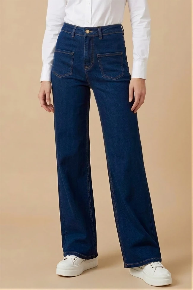 Koyu Mavi Yüksek Bel Çift Cepli Palazzo Kot Pantolon