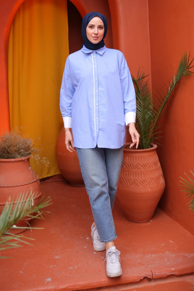 * Ürün Detay : Yeni sezona uygun poplin kumaştan üretilmiştir. Kendinden çizgi desenlidir. Önü kısa arkası uzun bir modeldir.