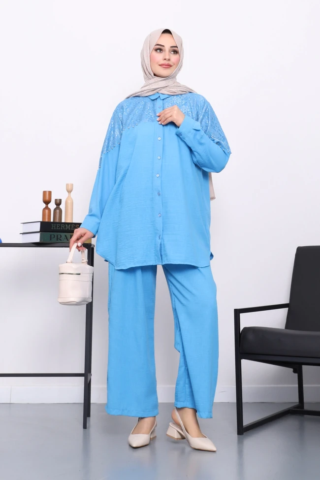 Kahverengi Dantel Detaylı Boncuklu Tunik Pantolonlu Takım Bej Dantel Detaylı Boncuklu Tunik Pantolonlu Takım