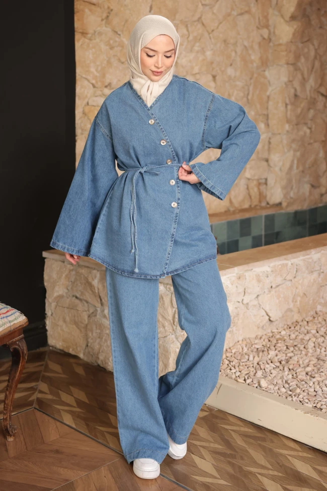 * Ürün Detay :Klasik denim kumaşın, kimono ve kruvaze kesim gibi modern terzilik detaylarıyla birleşmesi ortaya oldukça özgün bir ürün çıkarmış.Ceketin çapraz kapanan ön kısmı ve yan tarafa yerleştirilmiş düğme detayları, takıma modern bir imza kazandırıyor. Bu asimetri, standart ceket formlarından sıkılanlar için harika bir alternatif.Geniş ve dikişsiz omuz yapısı ile bol kesim kollar, takıma esintili bir minimalizm katmış.Ceketin bol kesimine rağmen ince bir kuşakla belin vurgulanması, geniş silüetin içinde vücut formunun kaybolmasını engellemiş.yüksek bel palazzo cepli bel lastikli