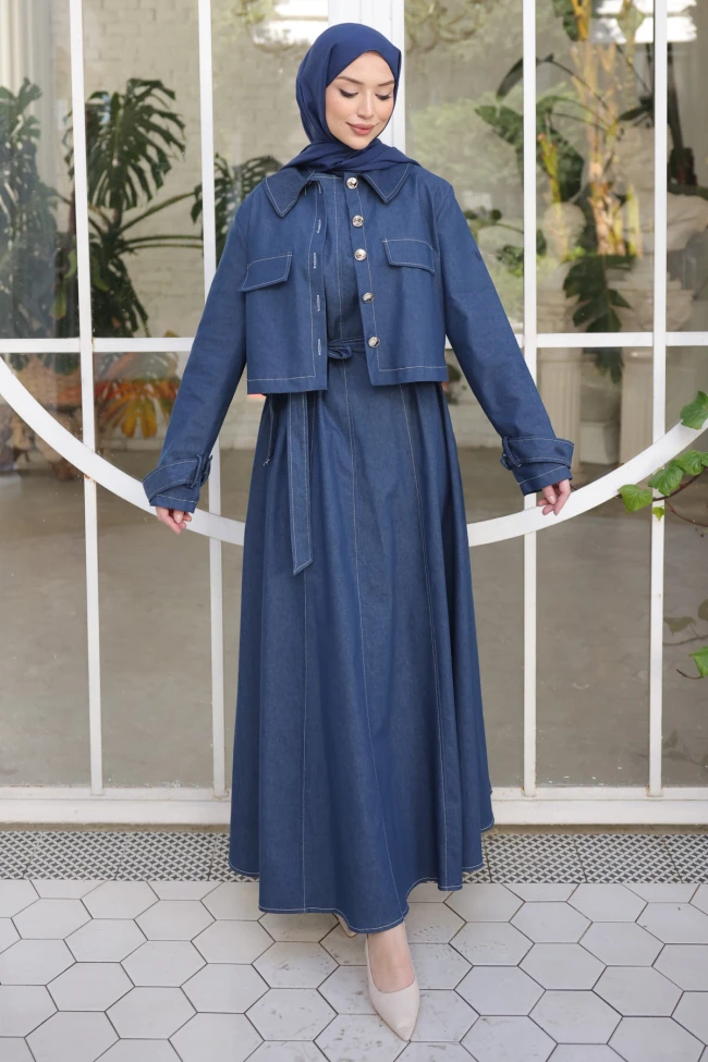 * Ürün Detay : Takımı, klasik jean dokusunu modern ve feminen bir formla buluşturan oldukça etkileyici bir parça.Kısa kesim ceket, alt parçadaki uzun ve dökümlü elbiseyi dengeleyerek boyu daha uzun gösteriyor. Geniş yakalar ve metal düğmeler, takıma hem güçlü hem de şık bir hava katmış.A-kesim etek formu, beldeki kemerle birleşince çok zarif bir silüet oluşturuyor. Belin vurgulanması, denim kumaşın sertliğini kırarak daha yumuşak bir duruş sağlamış.Parçaların üzerindeki belirgin beyaz dikişler, tasarıma mimari bir derinlik katıyor ve kıyafetin hatlarını çok net bir şekilde ortaya çıkarıyor.