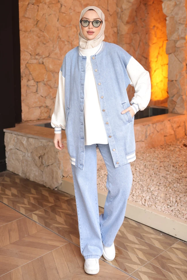* Ürün Detay : Takım, modern sokak stilini modest çizgileriyle harika bir şekilde birleştirmiş.Klasik kolej ceket formunda tasarlanması, takıma dinamik ve genç bir hava katmış. Denim gövde ile beyaz kolların kontrastı görsel bir derinlik sağlıyor. Uzun kesimi sayesinde tesettür giyim standartlarına tam uyum sağlamış.Pantolonun bol paça kesim tercih edilmesi hem konforu artırmış hem de ceketin salaş tarzını tamamlamış. Denim dokusuyla bütünlük sağlıyor.Ceket uçlarındaki ve kollarındaki çizgili ribana detayları, kolej stilini vurgulayan başarılı bir dokunuş.