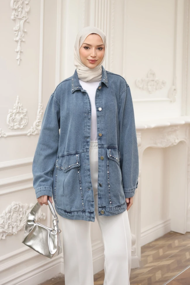 Koyu Mavi Taşlı Kot Ceket Füme Taşlı Kot Ceket