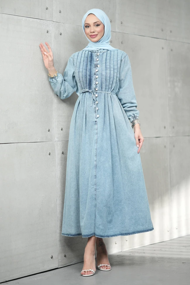 Lacivert Yarım Düğmeli Pileli Kot Elbise Füme Yarım Düğmeli Pileli Kot Elbise