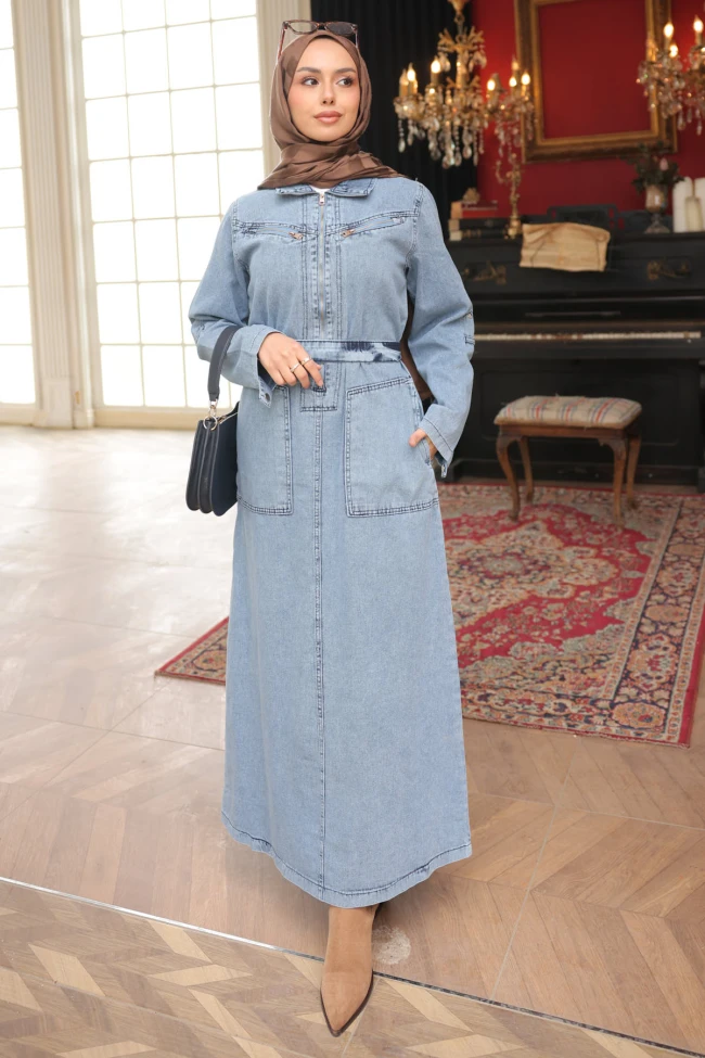 Lacivert Yarım Fermuarlı Cepli Kot Elbise