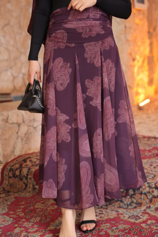 Siyah Desenli Beli Büzgü Detaylı İçi Astarlı Şifon Etek Lacivert Desenli Beli Büzgü Detaylı İçi Astarlı Şifon Etek Kahverengi Desenli Beli Büzgü Detaylı İçi Astarlı Şifon Etek