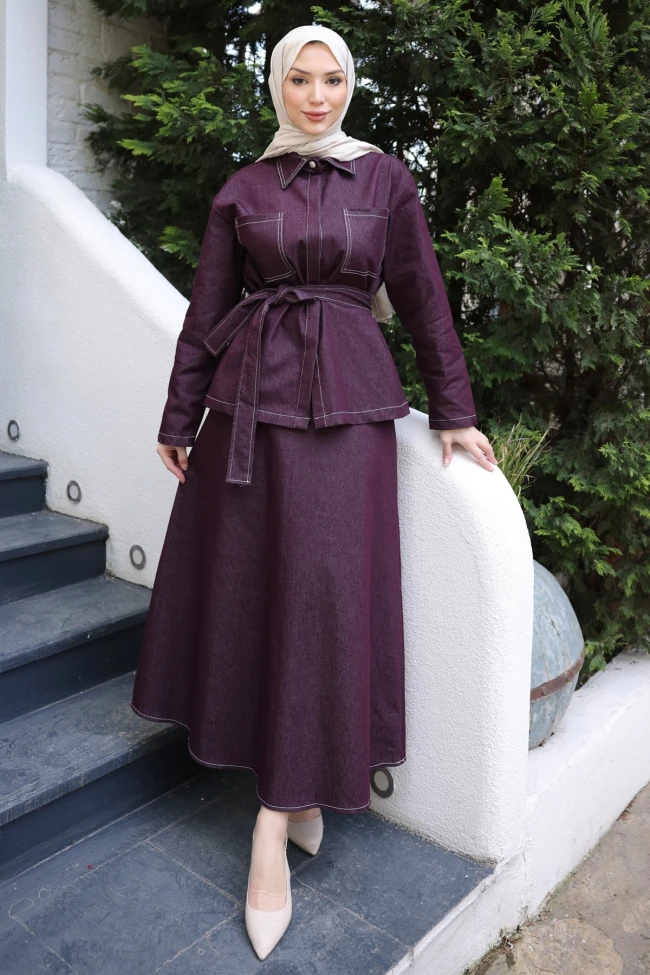 * Ürün Detay :Şık ve modern denim takım, klasik jean dokusunu zarif bir silüetle birleştirerek günlük şıklığı bir üst seviyeye taşıyor. Hem konforlu hem de iddialı bir görünüm arayanlar için ideal bir seçenek.Gömlek yaka kesimi ve ön kısımdaki geniş yama ceplerle fonksiyonel bir şıklık sunar. Bel kısmındaki ayarlanabilir kuşak detayı, vücut hatlarını zarifçe ortaya çıkarırken cekete feminen bir hava katar.Yüksek bel ve hafif A-kesim formuyla hem hareket özgürlüğü sağlar hem de asil bir duruş sergiler. Bilek boyu tasarımıyla tesettür giyim ve modern kombinler için mükemmeldir.Ürünün tamamında kullanılan beyaz kontrast dikişler, denim kumaşın derinliğini artırarak tasarıma mimari bir dokunuş katar.