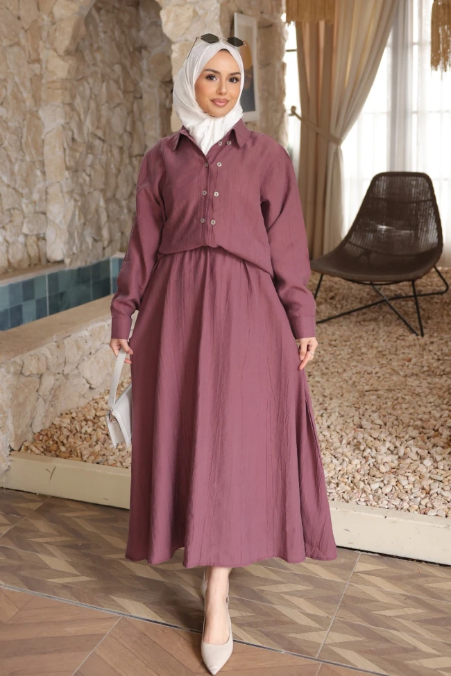 * Ürün Detay : Takım olmanın pratikliği, tek parça şıklığıyla birleşti. İster beraber giyin, ister parçaları farklı kombinlerle değerlendirin; dolabınızın en joker parçası olmaya aday!Hem zarafeti hem de konforu bir arada arayanlar için gerçek bir "kurtarıcı parça" niteliğinde.Gömlek boyunun etekle buluştuğu nokta, beli olduğundan daha ince gösterirken, eteğin geniş kesimi hareket özgürlüğü sunuyor.