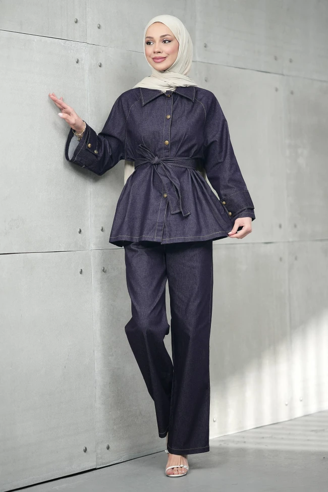 * Ürün Detay : Kot takım, hem modern hem de mütevazı giyim tarzını çok şık bir şekilde birleştirmiş.Beldeki kuşak detayı, silüeti belirginleştirerek feminen bir hava katmış. Geniş manşetler ve metal düğmeler, klasik kot ceket havasını daha sofistike bir "ceket-tunik" formuna taşımış.Bol paça kesim, hem rahatlık sunuyor hem de üzerindeki daha hareketli ceketle dengeli bir görünüm oluşturuyor. Boyu ve dökümü oldukça yerinde duruyor.Pantolon yüksek bel,bel lastikli ve ceplidir.
