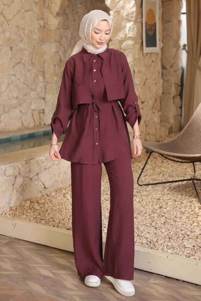 * Ürün Detay : Takım, hem modern hem de oldukça şık bir tasarıma sahip.Beldeki bağlama detayı vücut hatlarını zarifçe belirginleştirirken, göğüs kısmındaki katmanlı (pelerin havası veren) detay tasarıma hareket katmış.Düğmeli olması kullanım kolaylığı sağlıyor.Bol paça kesim, hem gün boyu konfor sunar hem de boyu olduğundan daha uzun gösterir. Kumaşın dökümlü yapısı takımın kalitesini ön plana çıkarıyor.Pantolon bel lastikli ve cepli.