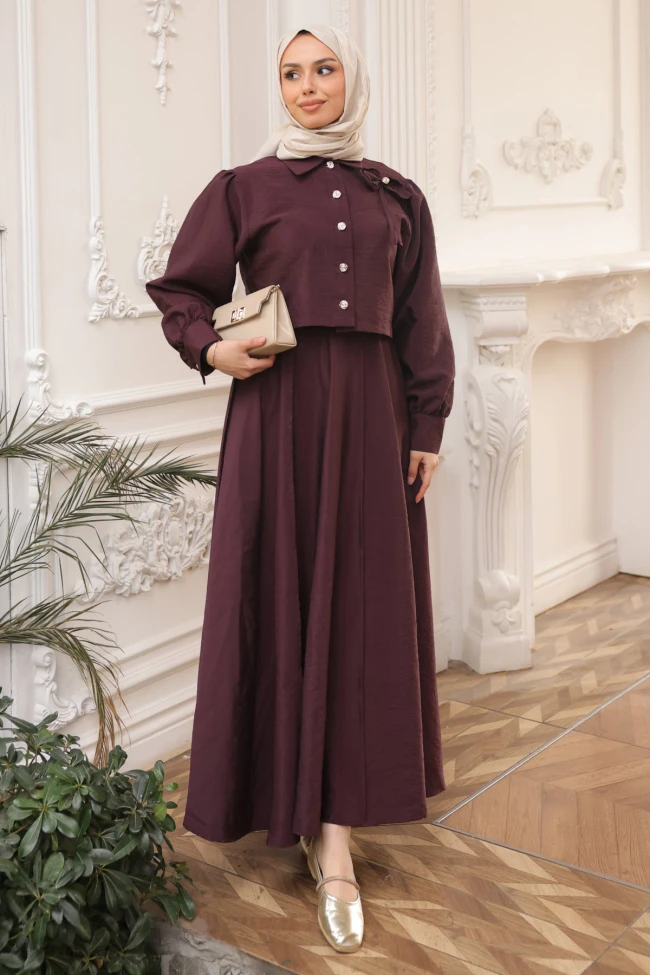 * Ürün Detay : İkili takım, hem klasik hem de modern detayları bir araya getiren oldukça şık bir tesettür kombin örneği.Crop ceket formu, beli daha yüksek göstererek boyu uzun gösterme avantajı sağlıyor. Gömlek yaka ve gold rengi taşlı düğmeler, tasarıma feminen ve zarif bir hava katmış. Omuzlardaki hafif büzgü, modern bir silüet oluşturuyor.Yüksek belli, geniş kesim etek, üst parçanın kısalığını mükemmel dengeliyor. Kumaşın dökümlü duruşu hem konforlu hem de asil bir görünüm sunmuş.