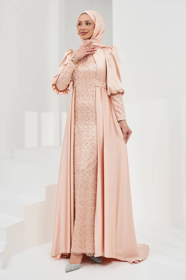 * Ürün Detay : Abiyemiz, özellikle özel davetler ve ağır organizasyonlar için tasarlanmış, modest moda anlayışını yansıtan oldukça ihtişamlı bir parça.Elbisede iki farklı doku çok başarılı şekilde harmanlanmış. Gövde kısmında kullanılan yoğun payet işlemeli kumaş, elbiseye derinlik ve ışıltı katarken; yanlarda ve omuzlarda kullanılan saten kumaş, asil bir duruş sergiliyor.Belden aşağıya doğru süzülen saten paneller,pelerin havası yaratmış. Bu detay, yürürken hareket kabiliyeti sağlarken aynı zamanda silüeti daha uzun ve heybetli gösteriyor.Omuzlardaki hafif kabarık kesim, dik bir duruş sergilenmesine yardımcı oluyor. Kolların dirsek altından itibaren payetle devam etmesi, tasarımdaki bütünlüğü korumuş.Bel hattındaki payet detaylı kuşak formu, vücut hatlarını zarifçe ayırarak elbiseye form kazandırmış.
