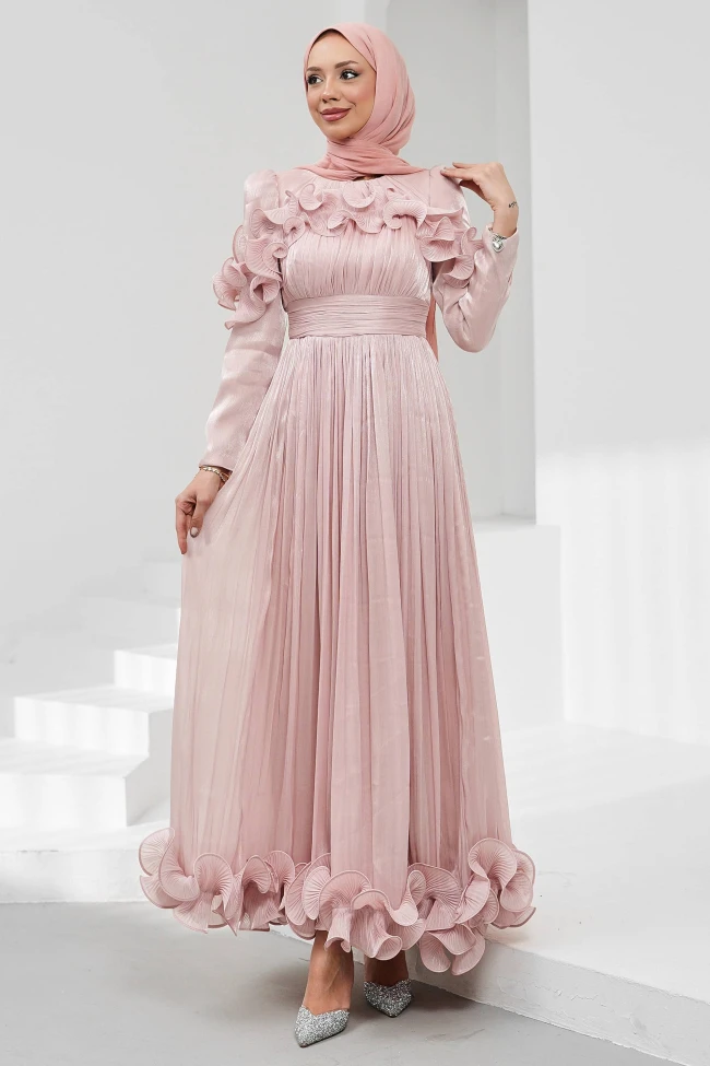 * Ürün Detay : Abiye, hem asil hem de oldukça hareketli bir tasarıma sahip.Elbisenin boydan boya piliseli olması, silüeti daha uzun ve ince gösteren harika bir işçilik. Ayrıca eteğin akışkanlığını artırarak yürürken çok şık bir hareket sağlar.Omuzlardaki ve etek ucundaki dairesel fırfır detayları elbiseye romantik ve maksimalist bir hava katmış. Özellikle omuzlardaki katmanlar, dar omuzlu kişileri daha dengeli gösterir.