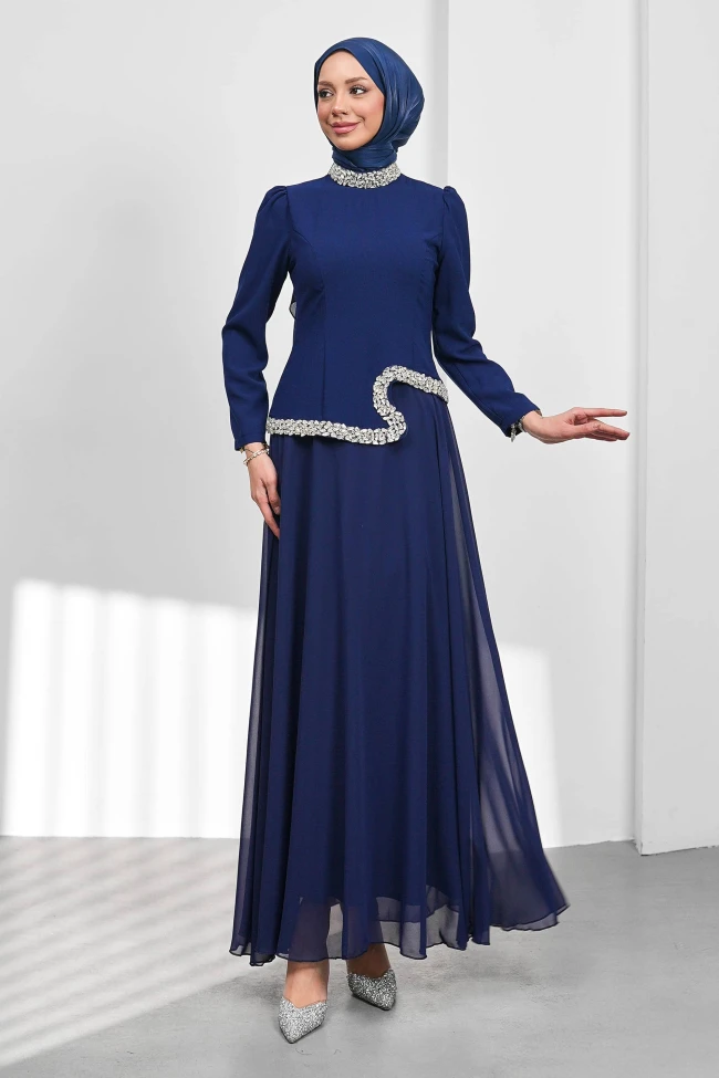 * Ürün Detay : Zamansız şıklık temasını modern taş detaylarıyla birleştiren, oldukça zarif ve rafine bir abiye model ile karşınızdayız.Elbisenin en dikkat çekici özelliği, yaka ve bel hattında kullanılan geniş taş işlemeleri. Yaka kısmındaki taşlar bir kolye etkisi yaratarak yüze ışıltı katarken, beldeki asimetrik kıvrımlı taş hattı silüeti bölerek beli daha ince gösteren bir optik illüzyon yaratıyor.Üst beden daha tok ve formu koruyan bir kumaştan tercih edilmişken, etek kısmında kullanılan hafif şifon doku, elbiseye uçuş uçuş bir hava ve feminen bir hareketlilik kazandırmış.Omuzlardaki hafif büzgüler ve düz kol kesimi, taşların yarattığı ihtişamı dengeleyerek tasarımın asaletini korumasını sağlıyor.özel günlerde "garanti şıklık" arayan, hem klasik hem de modern detayları seven müşteri kitlesi için bu parça ideal bir seçenek olacaktır.
