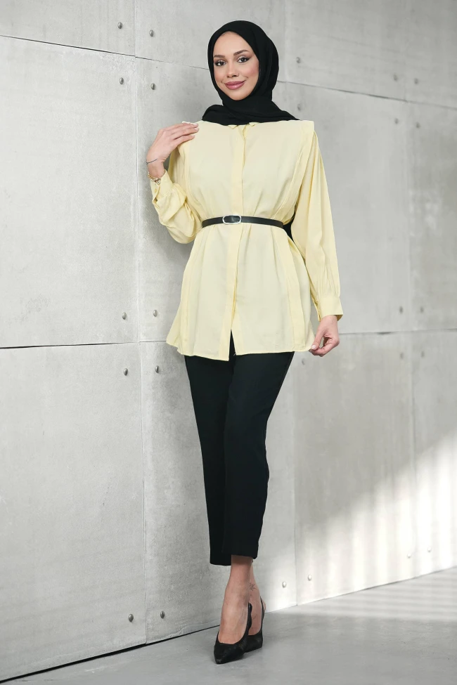 * Ürün Detay : Tunik, hem günlük kullanım hem de ofis şıklığı için oldukça dengeli ve modern bir tasarıma sahip.Tunikteki en dikkat çekici unsur, omuzlardan göğüs hizasına inen fırfır veya apolet benzeri dikey şeritler.Manşetli ve hafif dökümlü kollar, tuniğe klasik bir gömlek havası katarken kullanım konforunu artırıyor.İnce bir kemerle kombinlenmesi, tuniğin bol kesiminden kaynaklanabilecek görünümü engelliyor ve vücut hatlarını zarifçe belli ediyor.