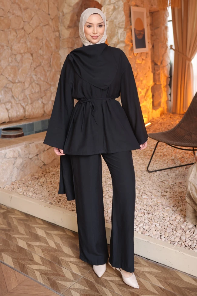 * Ürün Detay : Yeni sezon takımımız modern muhafazakar moda anlayışını yansıtan, hem konforlu hem de tasarım odaklı bir parça.Geniş kesim pantolon ve dökümlü tunik, hem modern bir silüet oluşturuyor hem de tam kapalı giyim tercih edenler için ideal bir konfor sunuyor.Takımın ince kuşak detayı, dökümlü yapısına rağmen bel oyuntusunu belirginleştirerek proporsiyonu dengeliyor.Üst parçadaki katmanlı görünüm, bir şal veya pelerin havası vererek kıyafete sofistike bir derinlik katmış.Pantolon yüksek bel,bel lastikli ve ceplidir.