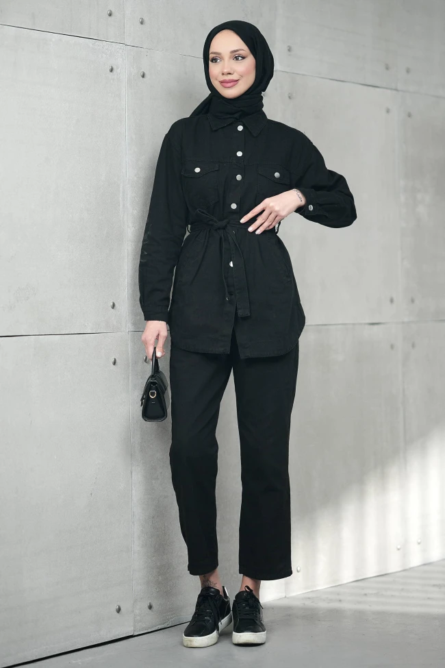 * Ürün Detay : Vücut hatlarını zarifçe dengeleyen kuşak detayı ve nefes alan dokusuyla gün boyu konfor sunan bu takım; modern kesimiyle stilinizi, zamansız rengiyle de kombinlerinizi güçlendiriyor.Ceketin belden kuşaklı olması, oversize kesimi dengelerken vücut hatlarını çok belli etmeden zarif bir silüet oluşturmuş.Göğüs kısmındaki kapaklı cepler ve metalik düğmeler, takıma daha dinamik ve modern bir ceket-gömlek havası veriyor.Pantolonun boyu ve kesimi oldukça ideal.