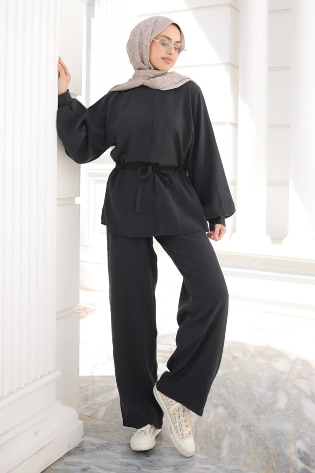 * Ürün Detay : Takım, doğal tonların asaletini ve fonksiyonel tasarımı bir araya getiren, koleksiyonunuzun en güçlü parçalarından biri olmaya aday.Üst parçada kullanılan kendi kumaşından ince bağlama kemeri, oversize bir tasarımı anında daha feminen ve derli toplu bir forma sokmuş. Belin vurgulanması, boyu olduğundan daha uzun gösteren bir illüzyon oluşturuyor.Balon kol yapısı, manşetlerdeki daralma ile birleşerek modern bir hacim oluşturmuş. Düşük omuz kesimi ise takımın o "çabasız şıklık" havasını destekliyor.Pantolonun boru paça yapısı ve kumaşın dökümlü dokusu, tesettür giyimde aranan o zarif ve hatları belli etmeyen silüeti başarıyla sağlıyor.Pantolon bel lastiklidir.