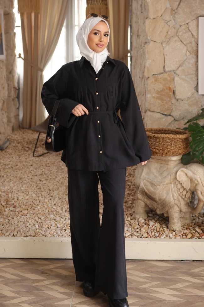 * Ürün Detay : Gardırobunuzun kurtarıcı parçası olmaya aday bu takım, hem ofis şıklığında hem de hafta sonu davetlerinde "ne giyeceğim?" derdine son veriyor.Tuniğin belden oturtmalı, aşağı doğru hafif genişleyen peplum kesimi, feminen bir silüet oluştururken aynı zamanda konforlu bir kullanım sunuyor. Pantolonun bol paça formu ise boyunuzu olduğundan daha uzun ve ince gösteren sihirli bir dokunuş sağlıyor.Pantolon bel lastikli ve ceplidir.